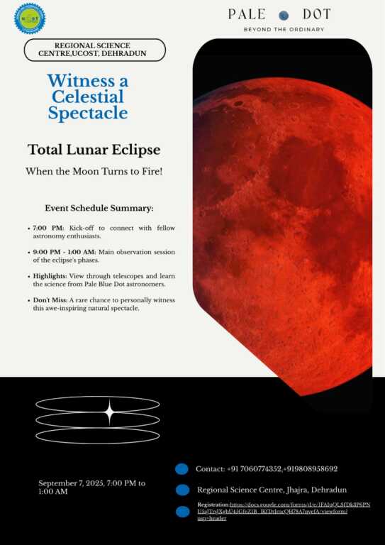 देहरादून: आसमान में इस बार कुछ बेहद खास होने जा रहा है। 7 सितंबर की शाम देहरादून के लोगों को एक अद्भुत खगोलीय घटना का साक्षी बनने का मौका मिलेगा। उत्तराखंड राज्य विज्ञान एवं प्रौद्योगिकी परिषद (यूकास्ट) द्वारा आयोजित इस विशेष कार्यक्रम में लोगों को टेलिस्कोप के माध्यम से पूर्ण चंद्र ग्रहण – जिसे “रक्त चंद्र” (Blood Moon) भी कहा जाता है – दिखाया जाएगा।