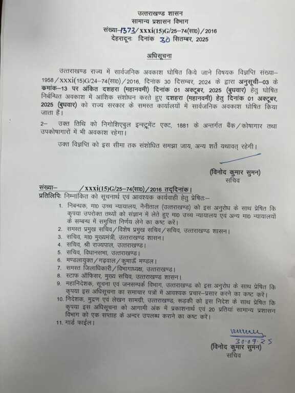 देहरादून: उत्तराखण्ड राज्य में सार्वजनिक अवकाश घोषित किये जाने विषयक विज्ञप्ति संख्या-1958/xxxi(15)G/24-74 (सा0)/2016, दिनांक 30 दिसम्बर, 2024 के द्वारा अनुसूची-03 के कमांक-13 पर अंकित दशहरा (महानवमी) दिनांक 01 अक्टूबर, 2025 (बुधवार) हेतु घोषित निर्बन्धित अवकाश में आंशिक संशोधन करते हुए दशहरा (महानवमी) हेतु दिनांक 01 अक्टूबर, 2025 (बुधवार) को राज्य सरकार के समस्त कार्यालयों में सार्वजनिक अवकाश घोषित किया जाता हैं।