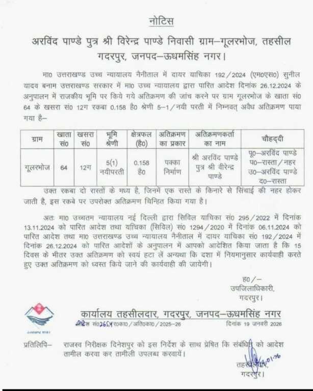 मा० उत्तराखण्ड उच्च न्यायालय नैनीताल में दायर याचिका 192/2024 (एम०एस०) सुनील यादव बनाम उत्तराखण्ड सरकार में मा० उच्च न्यायालय द्वारा पारित आदेश दिनांक 26.12.2024 के अनुपालन में राजकीय भूमि पर किये गये अतिक्रमण की जांच करने पर ग्राम गूलरभोज के खाता सं० 64 के खसरा सं0 12ग रकबा 0.158 है0 श्रेणी 5-1/ नयी परती में निम्नवत् अवैध अतिक्रमण पाया गया है।