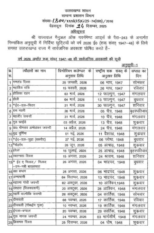 उत्तराखण्ड में शासन ने वर्ष 2026 की सार्वजनिक अवकाश सूची की जारी…….