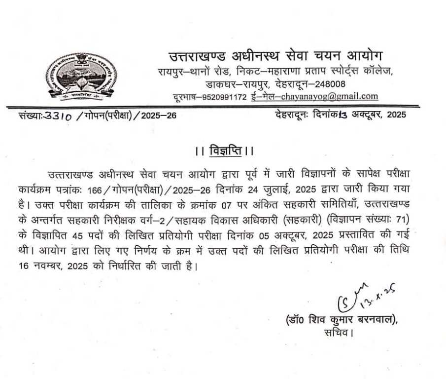 देहरादून: सहायक विकास अधिकारी (सहकारी) (विज्ञापन संख्याः 71) के विज्ञापित 45 पदों की लिखित प्रतियोगी परीक्षा दिनांक 05 अक्टूबर, 2025 प्रस्तावित की गई थी। आयोग द्वारा लिए गए निर्णय के क्रम में उक्त पदों की लिखित प्रतियोगी परीक्षा की तिथि 16 नवम्बर, 2025 को निर्धारित की जाती है।