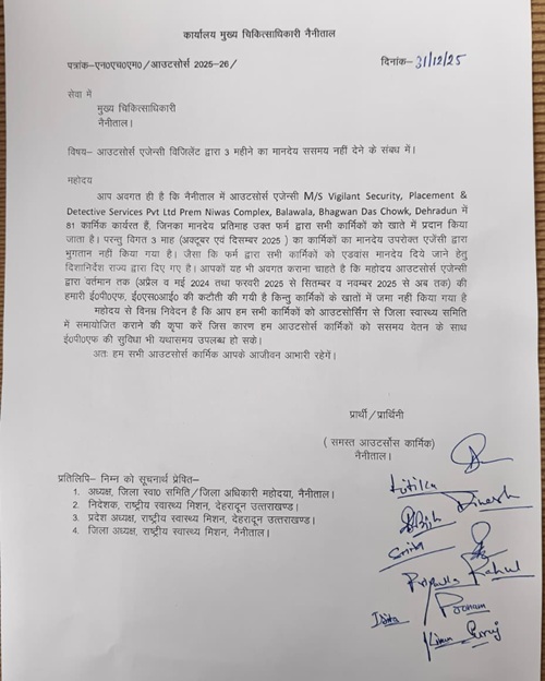 नैनीताल: जिले के चिकित्सा विभाग में बाहरी एजेंसी के जरिए कार्य करने वाले कर्मियों की धैर्य की सीमा अब पार हो चुकी है। तीन माह से वेतन न मिलने तथा ईपीएफ (EPF) में कटौती संबंधी गड़बड़ियों के कारण नाराज स्टाफ ने बाहरी फर्म की कथित अनियमितताओं के विरुद्ध मुख्य चिकित्सा अधिकारी (सीएमओ) नैनीताल को memorendum प्रस्तुत कर शीघ्र हस्तक्षेप की अपील की है।