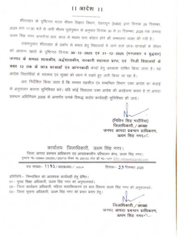 उत्तराखंड के ऊधमसिंह नगर में मंगलवार और बुधवार को स्कूल और आंगनबाड़ी केंद्र बंद रहेंगे………