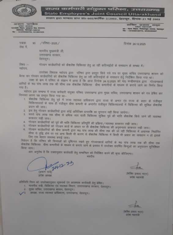 देहरादून: राज्य कर्मचारी संयुक्त परिषद उत्तराखण्ड के प्रदेश अध्यक्ष अरूण पांडे ने प्रेस विज्ञप्ति जारी कर बताया कि आज  मंत्रीमण्डल द्वारा गोल्डन कार्डधारियों को कैश लैश चिकित्सा व्यवस्था हाईब्रिड मोड में करते हुए रू0 पांच लाख की सीमा तक इन्योरेंन्स कम्पनी द्वारा एंव उससे अधिक व्यय वाले ईलाज पूर्व की भांति राज्य स्वास्थ्य प्राधिकरण द्वारा किये जाने का निर्णय किया गया है।