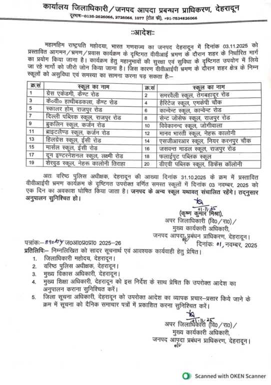 अतः वरिष्ठ पुलिस अधीक्षक, देहरादून की आख्या दिनांक 31.10.2025 के क्रम में प्रस्तावित वीवीआईपी भ्रमण कार्यक्रम के दृष्टिगत उपरोक्त वर्णित समस्त स्कूलों में दिनांक 03 नवम्बर, 2025 को एक दिन का अवकाश घोषित किया जाता है। जनपद के अन्य स्कूल यथावत् संचालित रहेंगे। तद्नुसार अनुपालन सुनिश्चित हो।